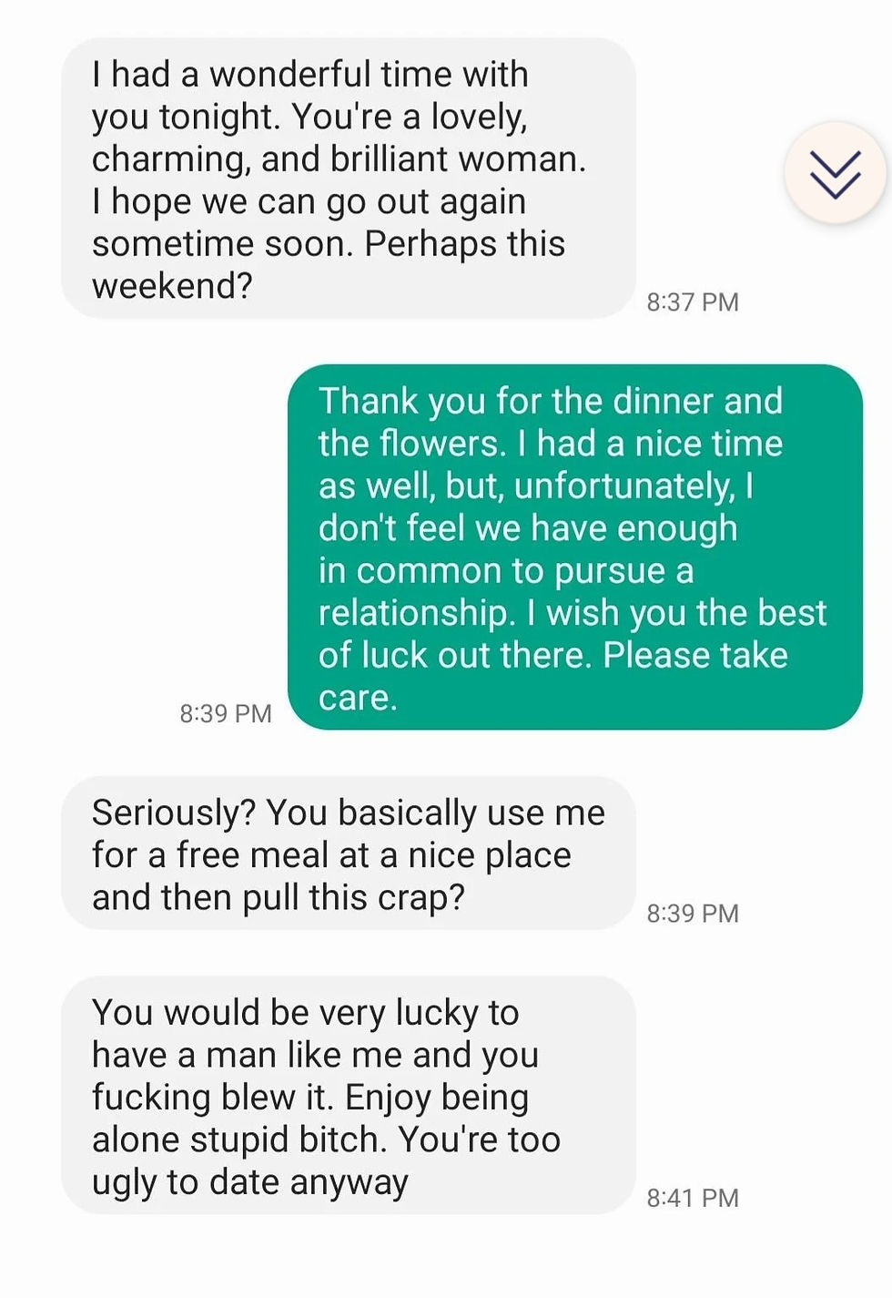 Pre-FDS me used to have anxiety about this. Post-FDS me understands that a man paying for dinner and buying me flowers does NOT Equal consent. I bet there is not a single woman alive who could fathom paying for dinner and then using it as way to coerce a man into sex or a relationship. How horrific and depraved. He told on himself. A date is to get to know one another. Nothing is guaranteed. He should not date if he can't afford to. He can pay $300 for an escort if that's what he wants. But he's broke so he's hoping to turn some innocent unsuspecting woman into a $100 prostitute. I've been on dates with men in the past who spent between $500-2k on a single date night, and bought me flowers. Yet they didn't expect anything in return. They were glad of my company. I only date wealthy men though because they rarely pull shit like this broke intolerable scrote. I bet he doesn't expect sex from his bros when he pays for them. He can't be kind or take a woman to dinner for the sake of being a kind gentleman. As with all scrotes, it's all about manipulating women to use their bodies and make them feel obligated. This kind of entitlement is absolutely terrifying. If the script was flipped I genuinely cannot imagine treating a man like this. Or anyone at all.