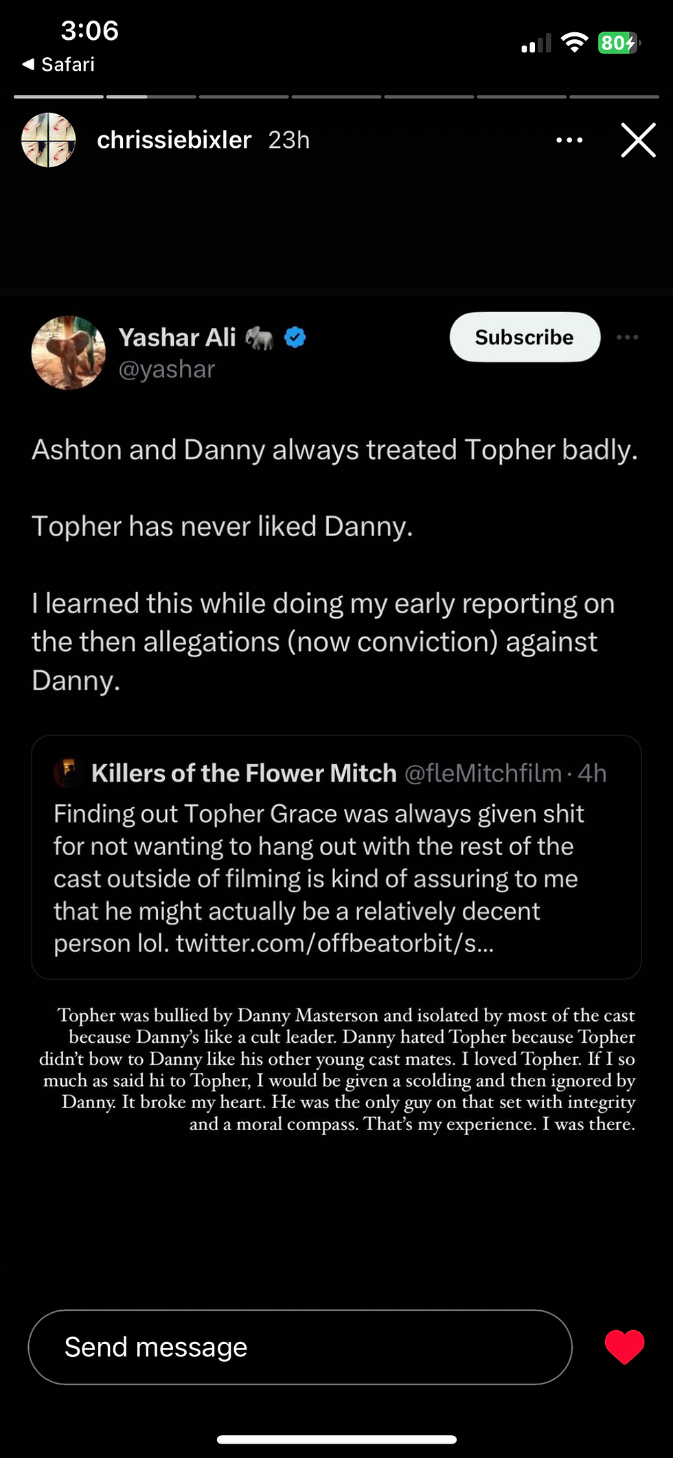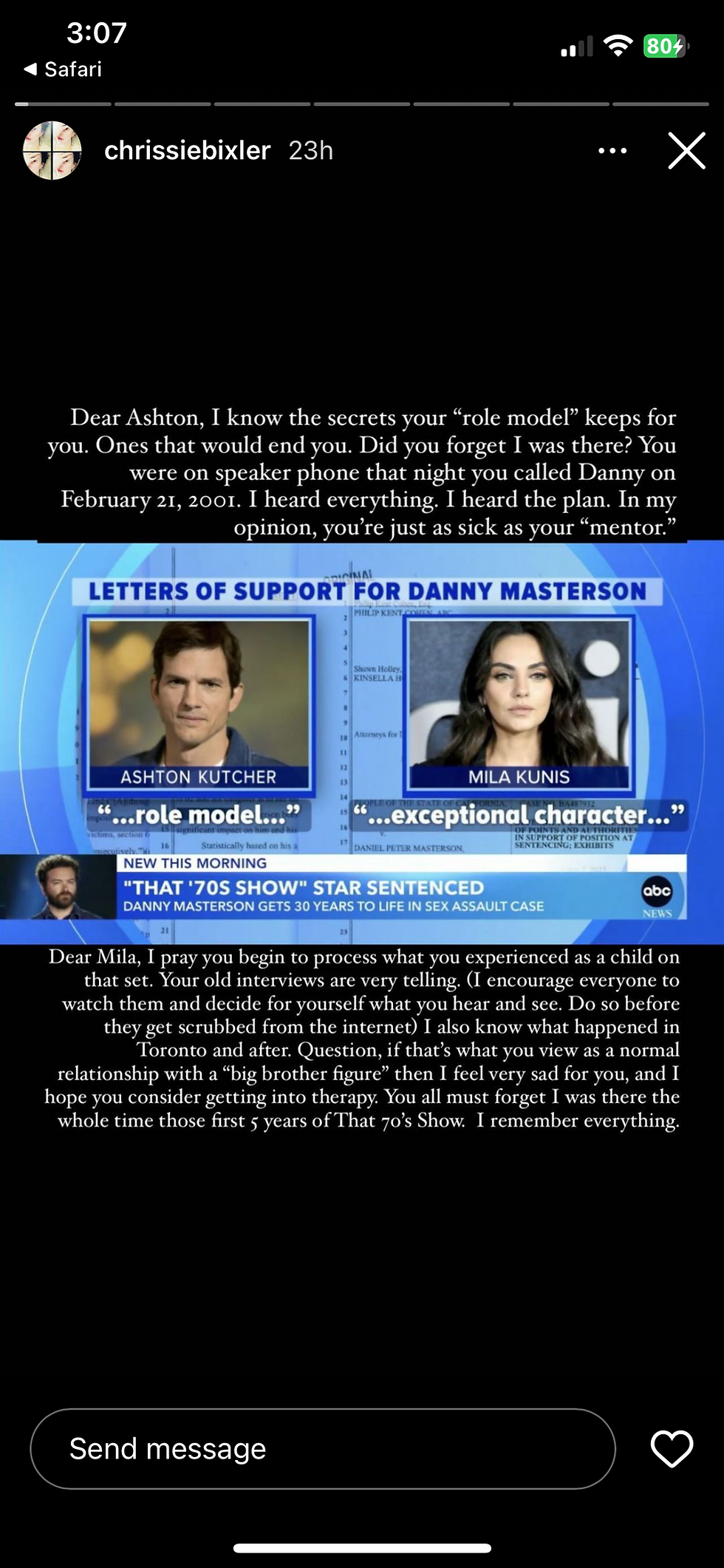 I know a lady who worked on set of that 70s Show and A physically assaulted her. During a set break she sat in front of A and D. A thought she was over hearing his conversation and screamed at her "No, I don't want you to sitting here!". She didn't even register that he was talking to her and then the next thing you know she was on the ground. He kicked her chair so hard that the chair ricochet and smacked her on the ass. A did it with such force too. She didn't deserve that. I'm glad everyone is seeing him for who he truly is.