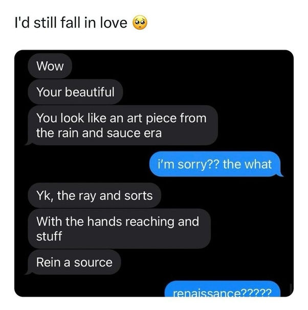 Although I can agree that men being atrocious at grammar is offputting, however I find it extremely unlikely that a guy who knows what ‘The Creation of Adam’ is, can’t spell Renaissance. It’s just a fake text convo.