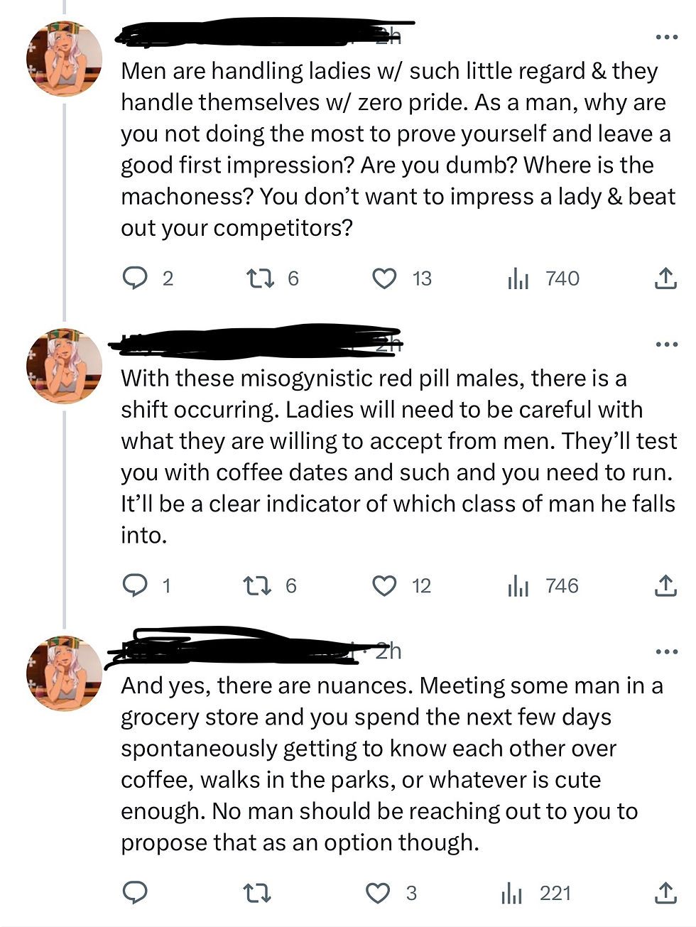 Every time I’m around women my age or younger I spend a little extra time talking about how great it is to have high standards and not put up with “drink dates” or other lv bs. Many of the men proposing that stuff literally have 10 coffee dates with women lined up, and I’m not interested in being around any man who sees me as a number.